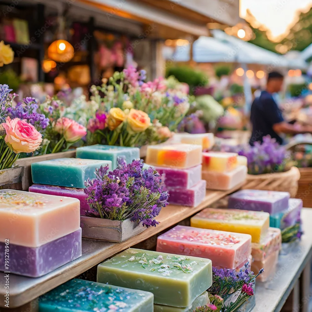 A farmer's market stall with handmade floral soap bars in eye-catching multi color hues