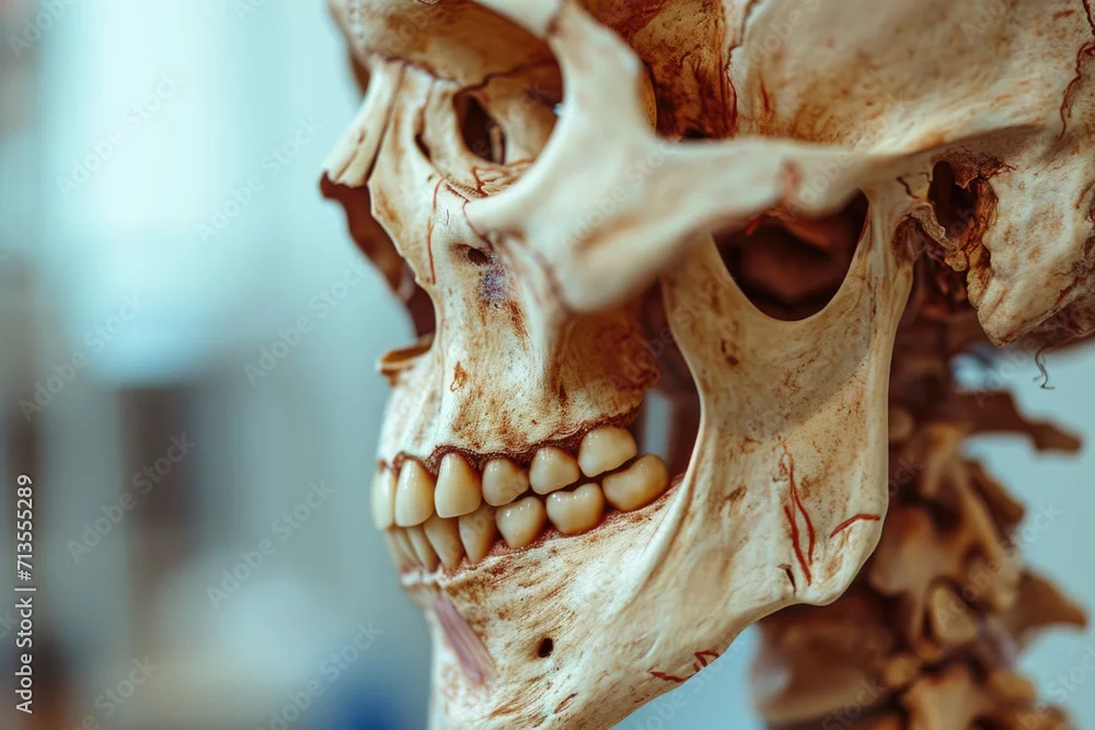 A human skull with a missing jaw and teeth. Can be used to depict death, anatomy, or forensic science