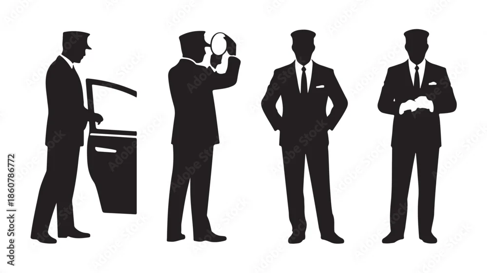 Chauffeur Service Staff in Professional Elegant Style with Black and White Vector Silhouettes for Luxury Transport and Hospitality Icons.