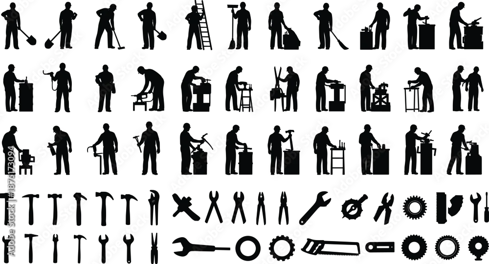 Collection of Industrial Construction Worker Silhouettes and Hardware Tool Icons Set for Professional Manual Labor Maintenance and Repair Service Design