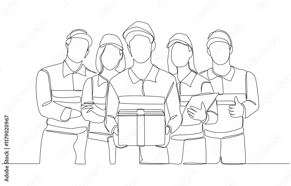 Continuous one line drawing of delivery service staffs standing in confident pose, shipping company, logistics business concept, single line art