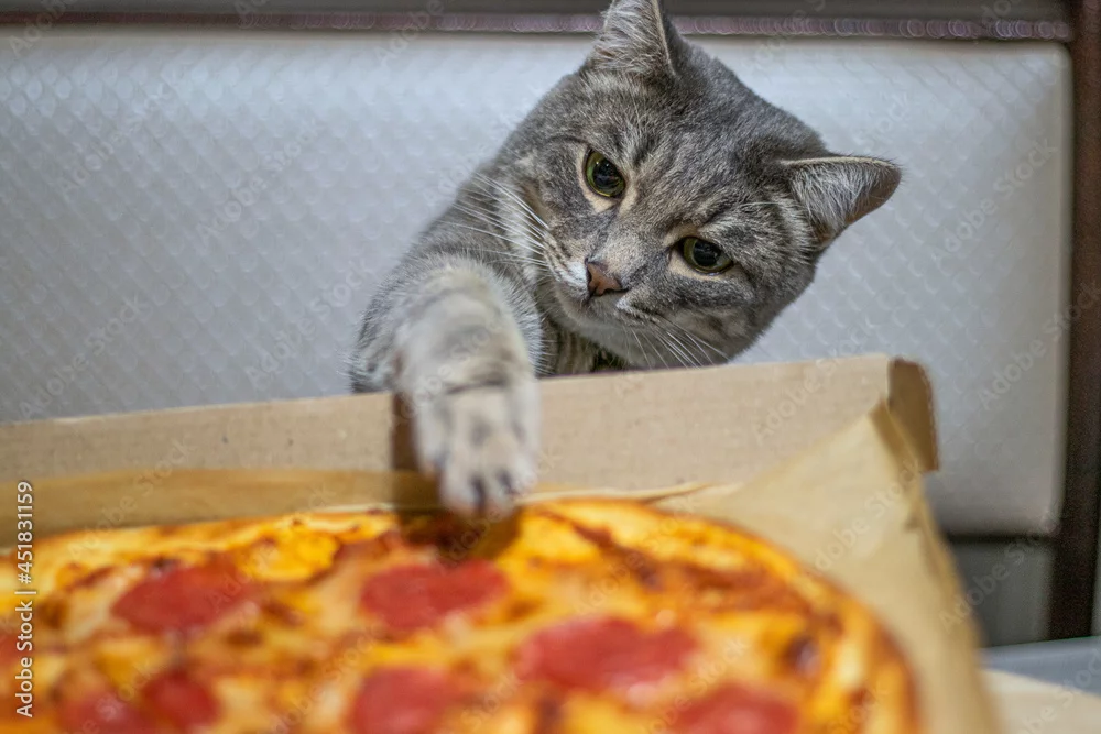 gray cute cat lover of pizza. the cat is trying to steal a pizza with its paw.
