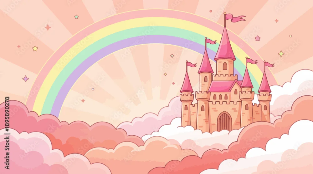Pastel floating castle among pink clouds with rainbow and sunburst, a magical fairy tale illustration for kids