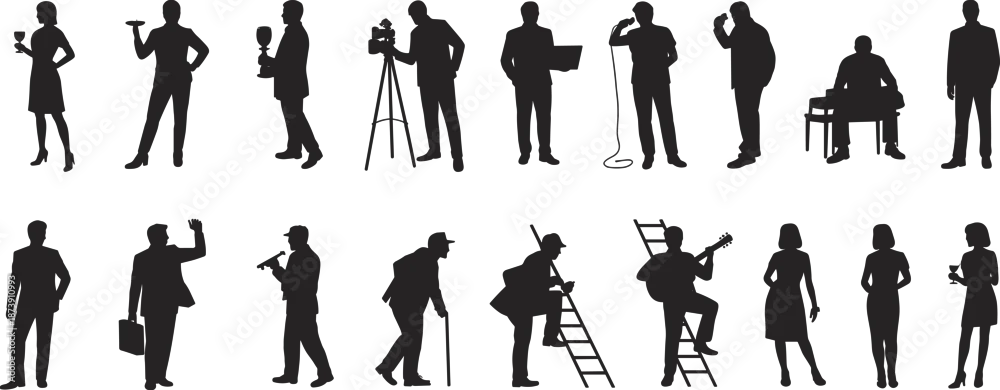Professional people silhouettes collection, business workers musicians photographers service staff poses, diverse occupations concept, black human figures, ...