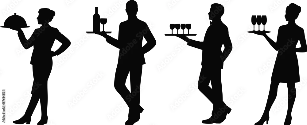 Waitstaff silhouette illustration set, tray service poses, black hospitality icons, beverage presentation graphic, catering staff design, restaurant service art
