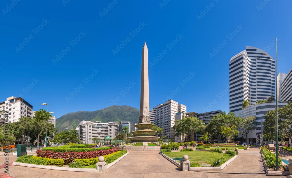 Panoramic view of Altamira's Obelisk on a sunny day with blue skies in Francia Square (A.k.a. Plaza Altamira), in venezuelan capital city Caracas, in ...