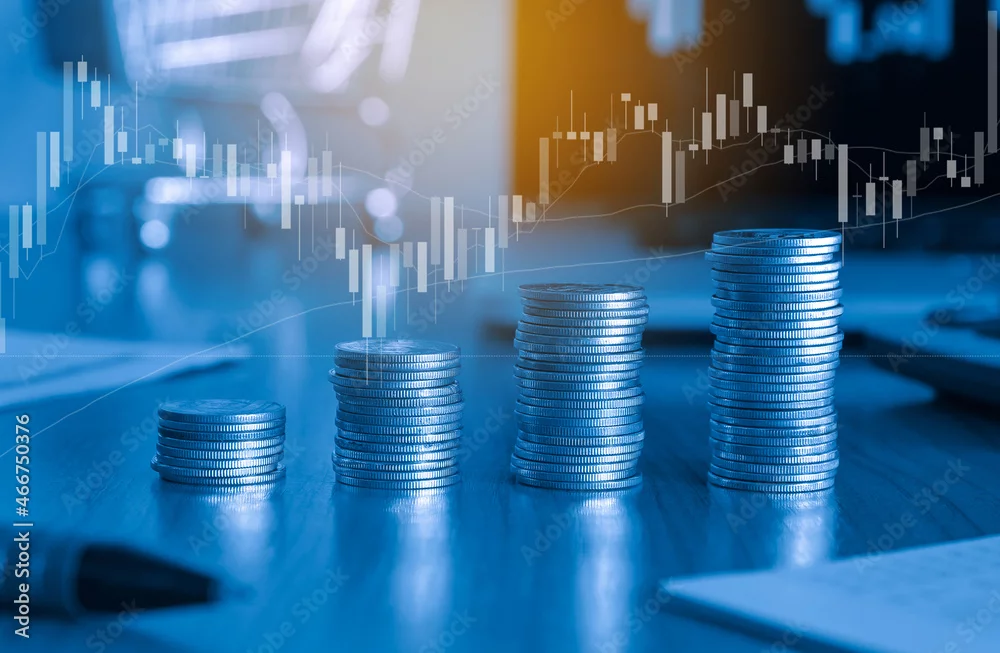 Stack of money coin and laptop computer in the background with trading graph, Business and Financial concept.